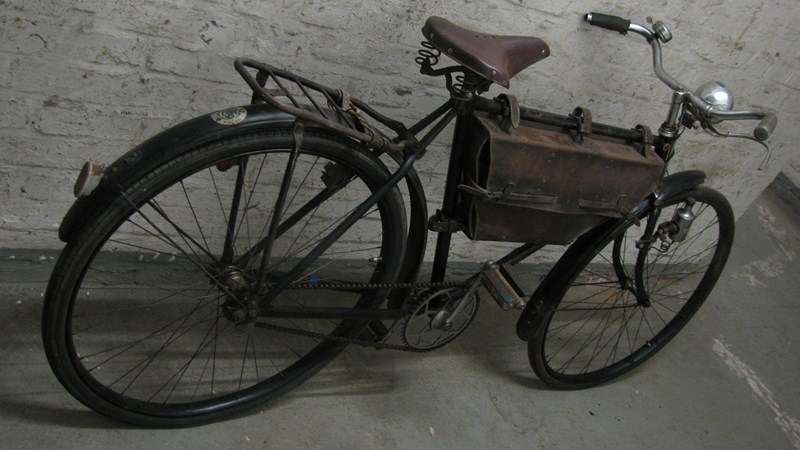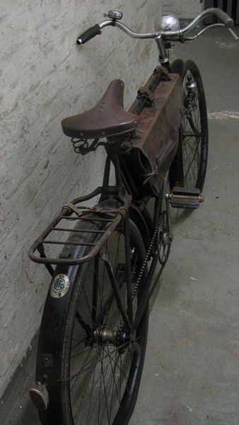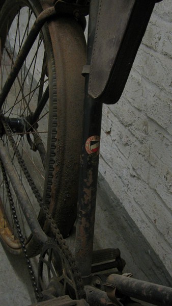 Hier jedoch ein Behörden/Soldaten Fahrrad mit lederner Transporttasche. Chrom wurde später gänzlich verboten und durch matt-schwarz lackierte Teile ersetzt. Auch das Leder war kriegswichtig geworden und verschwand bzw. wurde durch Ersatzstoffe ergänzt.