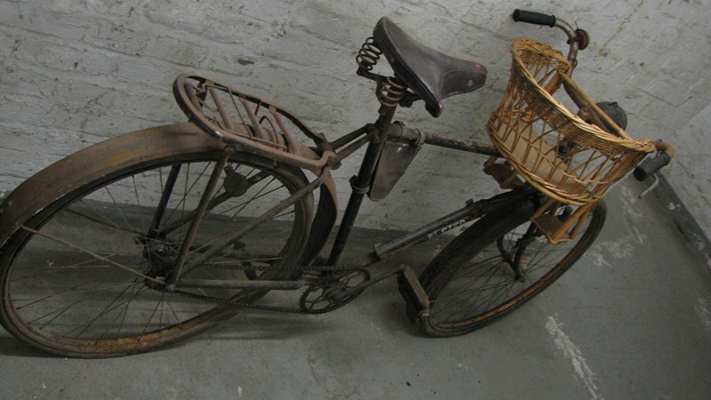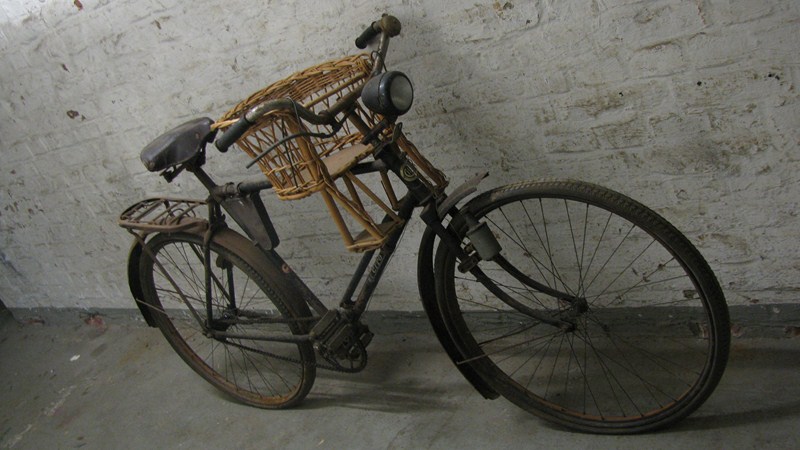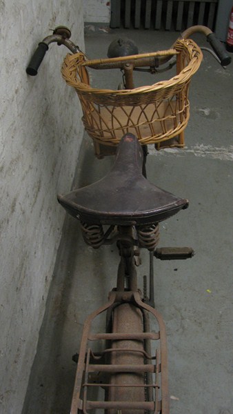 Das zweite Herrenrad mit Korbkindersitz ist aus dieser Zeit, der Sattel hier schon „Ersatzstoff“.