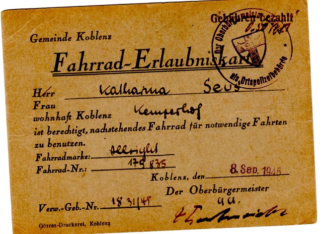 Ab 1945, als Deutschland in Trümmern lag, benötigte man eine von den Alliierten ausgestellten „Fahrrad-Erlaubniskarte“.