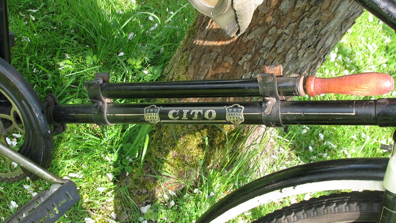 Das Cito Herrenrad weist typische Merkmale der Kriegsproduktion auf:  Die  normalerweise verchromten  Teile lackiert (hier mit schwach leuchtenden Farben an Lenker und Blechen), Tarnlicht vorne und hinten und entsprechende Ausrüstung wie Sanitäterflasche und Gasmaske.